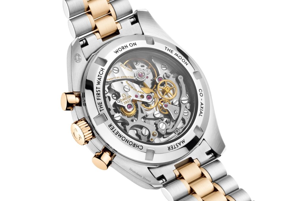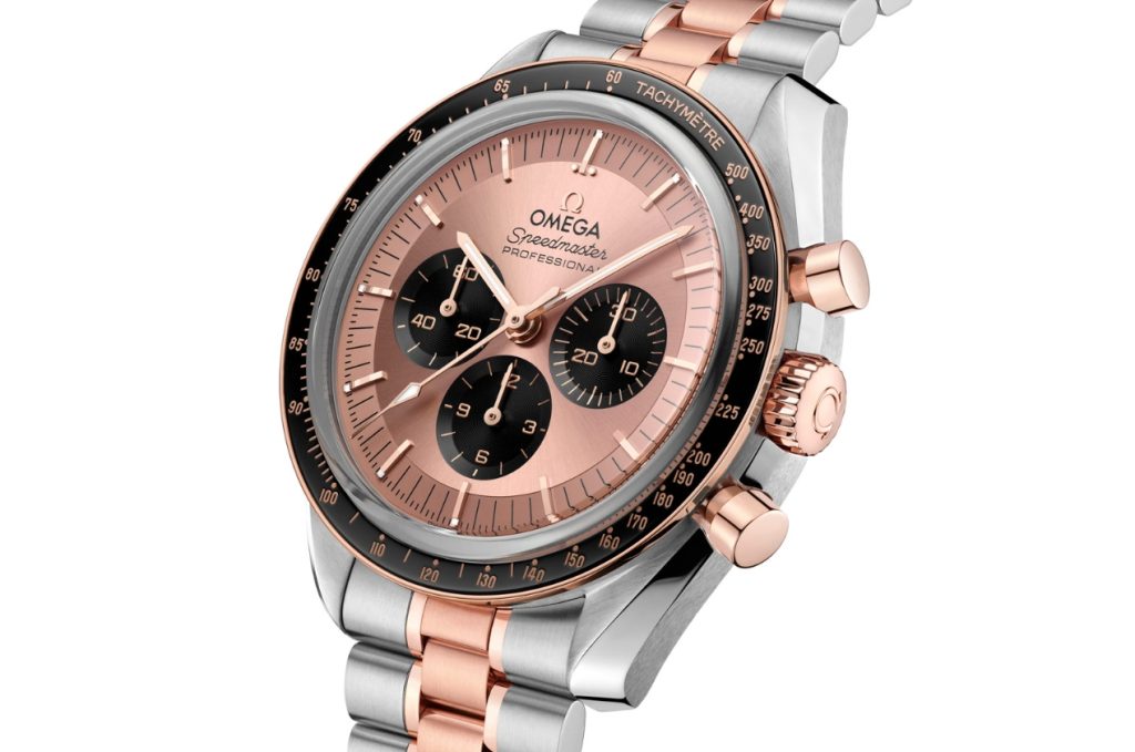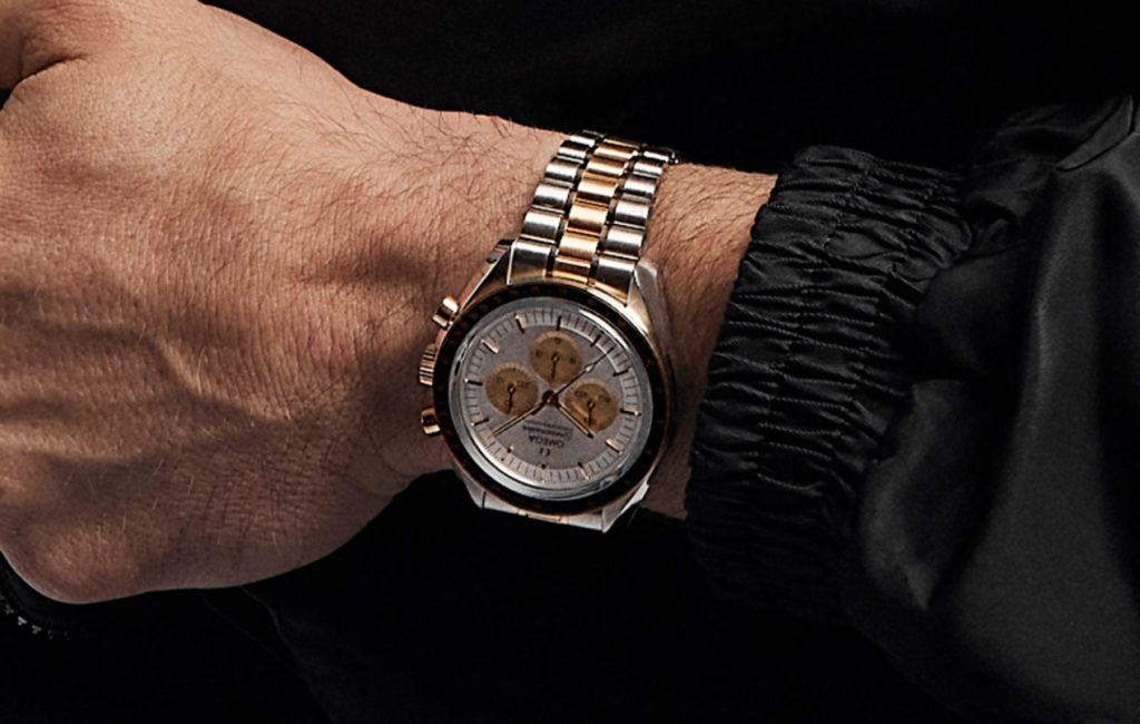 The two-tone Moonwatch retains the familiar 42 mm case with chamfered lugs, a stepped dial, and a Nixon-style bracelet (named after the all-gold Speedmaster model famous for being presented to Richard Nixon and other dignitaries of that era).