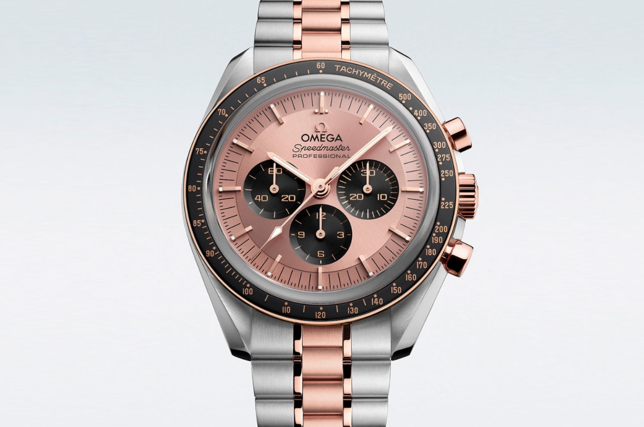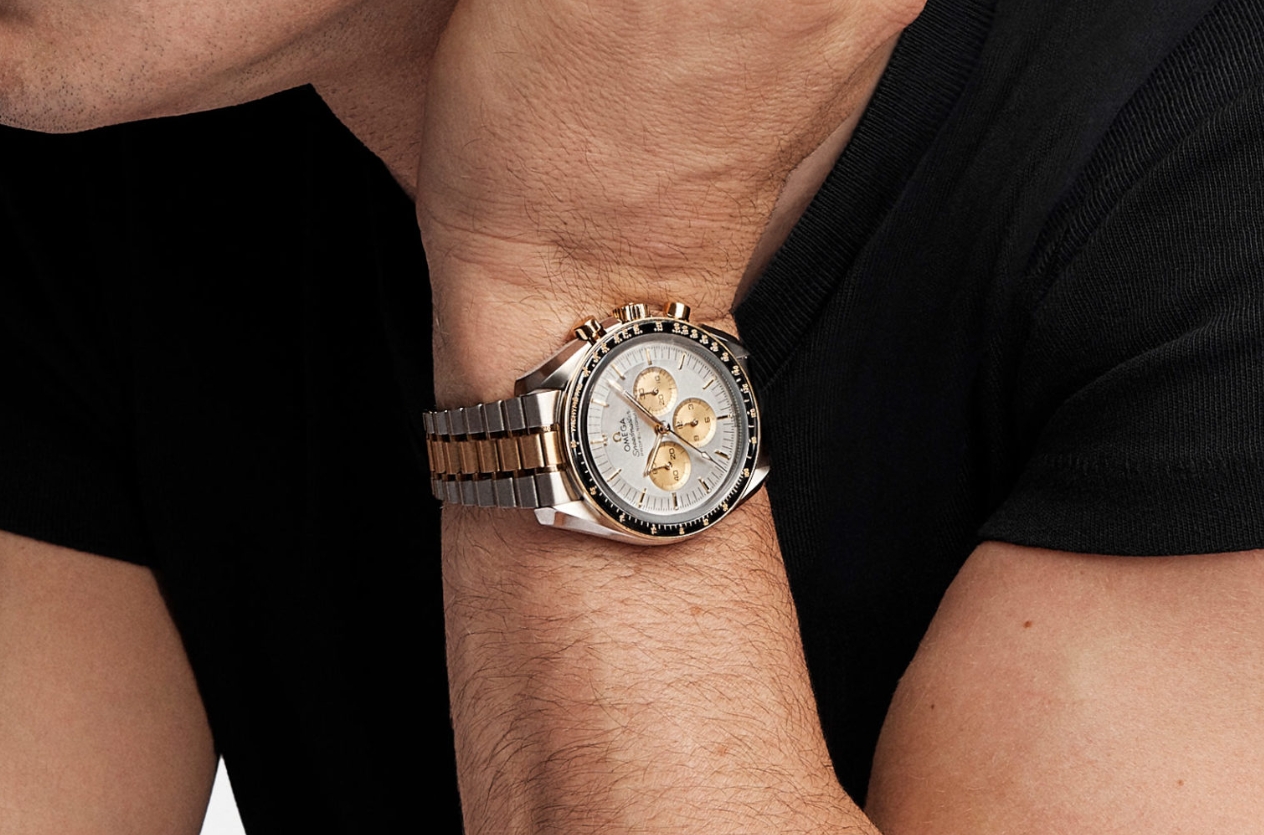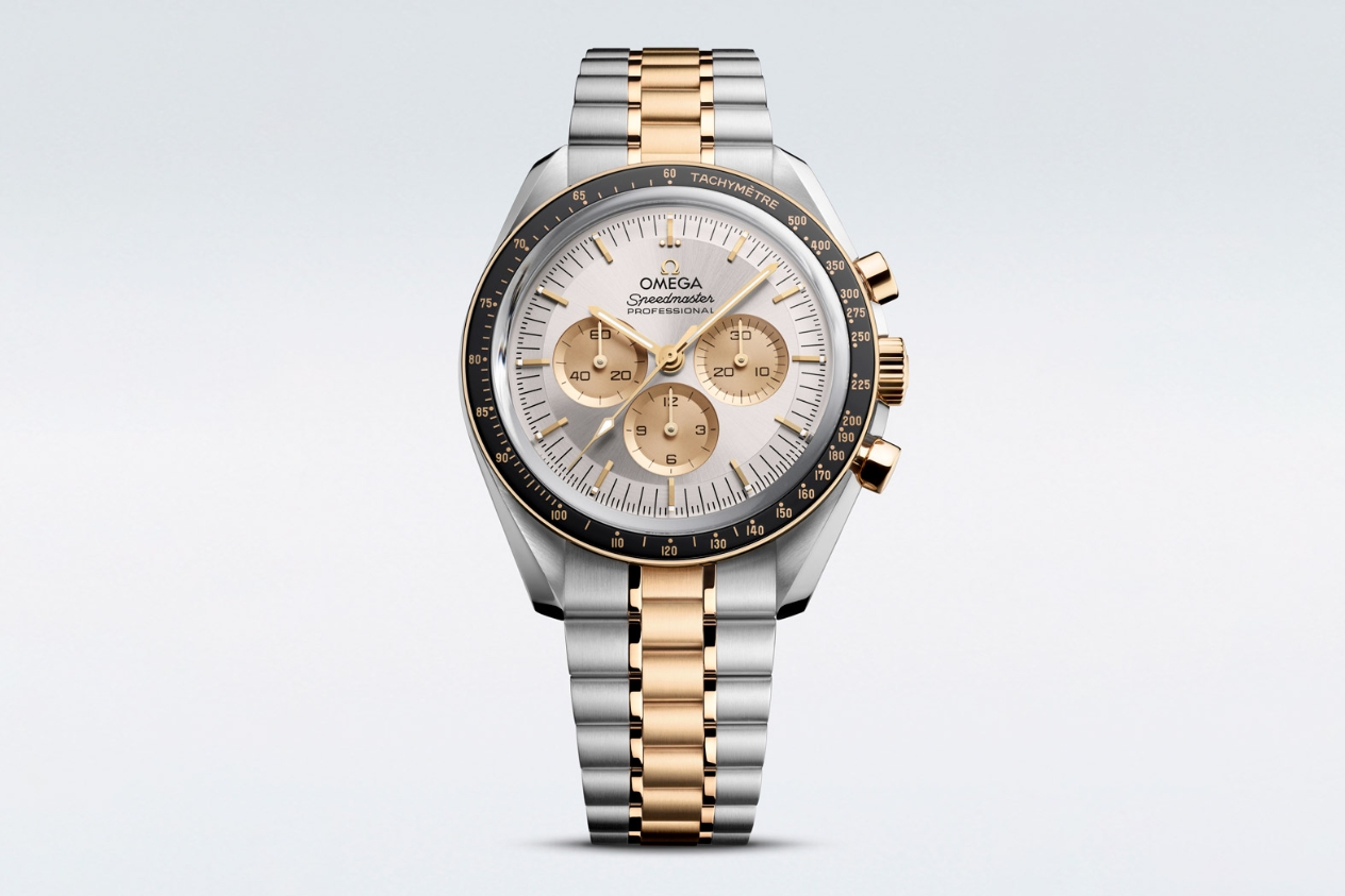 The two-tone Moonwatch retains the familiar 42 mm case with chamfered lugs, a stepped dial, and a Nixon-style bracelet (named after the all-gold Speedmaster model famous for being presented to Richard Nixon and other dignitaries of that era).